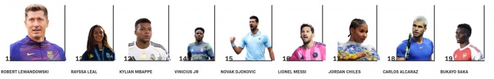 11-莱万(古代足球 )、12-赖萨-莱亚尔(女子旱冰 )、13-姆巴佩(古代足球 )、14-维尼修斯(古代足球 )、15-德约科维奇(网球运动活动 )、16-梅西(古代足球 )、17-乔丹-切尔斯(体操运动活动 )、18-阿尔卡拉斯(网球运动活动 )、19-萨卡(古代足球 )、20-安吉尔-里斯(篮球赛 )