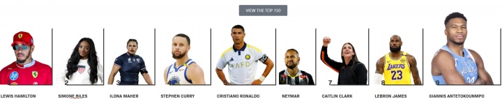 1-汉密尔顿(一级方程式)、2-拜尔斯(体操运动活动 )、3-马厄(女子美式古代足球 )、4-库里(篮球赛 )、5-C罗(古代足球 )、6-内马尔(古代足球 )、7-凯特琳-克拉克(篮球赛 )、8-詹姆斯(篮球赛 )、9-字母哥(篮球赛 )、10-高芙(网球运动活动 )