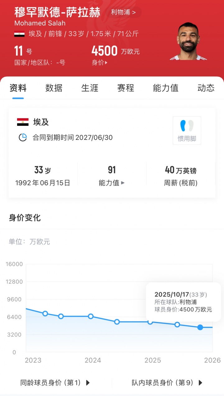 萨拉赫目前与利物浦的合同将在2027年到期,现身价4500万欧。