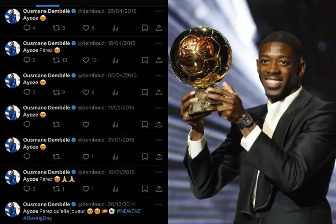 登贝莱曾非常欣赏阿约泽-佩雷斯,10年前,当时还在雷恩青训营、年仅17岁的登贝莱通过推特表达了对阿约泽-佩雷斯的喜爱,发布了很多推文,称其为“多么出色的球员!”