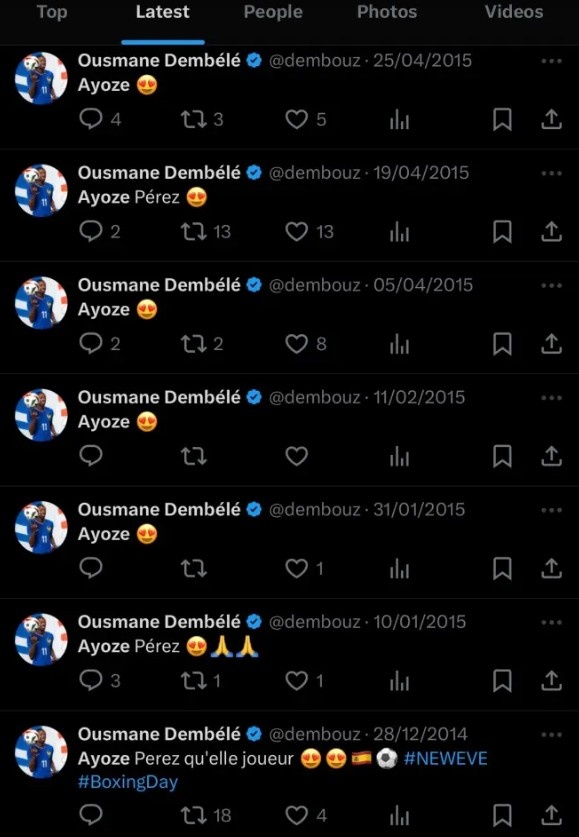 这些推文显示,现效力于比利亚雷亚尔的阿约泽-佩雷斯曾是登贝莱的偶像之一。
