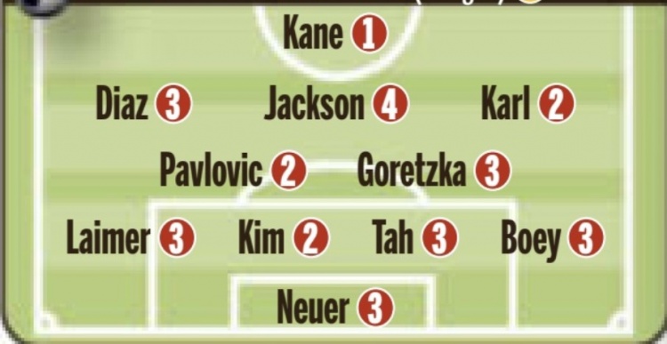 诺伊尔3分、莱默尔3分、金玟哉2分、塔3分、博伊3分、帕夫洛维奇2分、格雷茨卡3分、卡尔2分、迪亚斯3分、杰克逊4分、凯恩1分