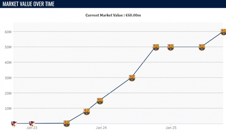 10月02日讯 今日德转更新西甲球员身价,巴塞罗那22岁中场球员费尔明身价上涨1000万至6000万欧元,刷新生涯新高。