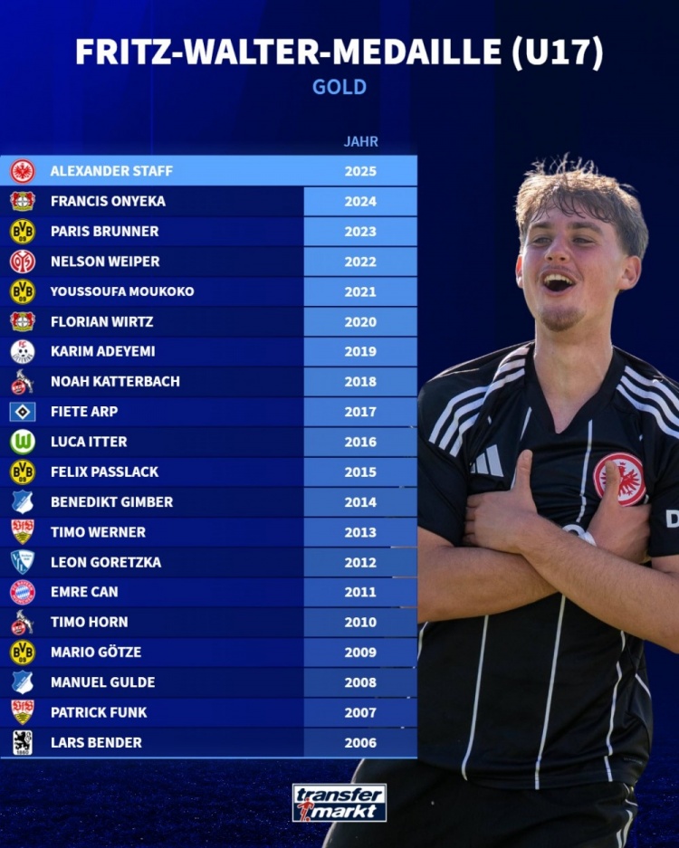 10月17日讯 法兰克福前场球员斯塔夫当选德国U17年度最佳新秀,英超直播_英超直播免费高清直播_英超直播在线高清(无插件)-24直播网德国转会市场列出了历届德国U17年度最佳新秀名单。