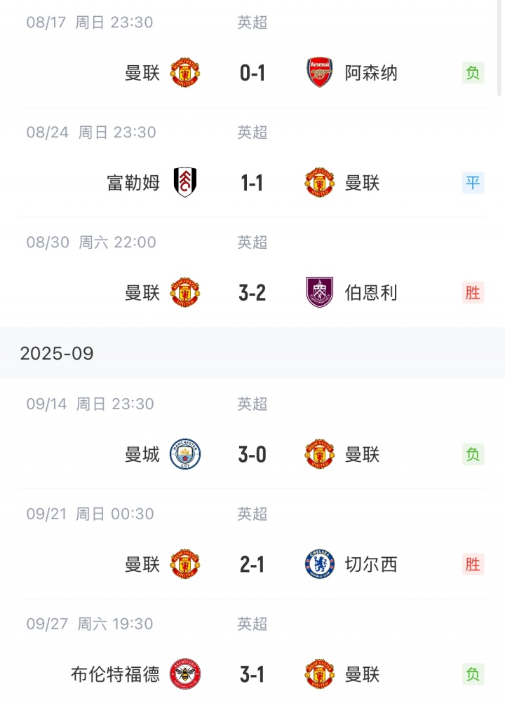 曼联英超战绩: