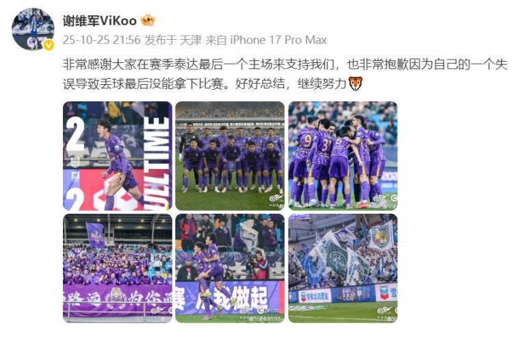 赛后,谢维军在个人微博中写道:非常感谢大家在赛季泰达最后一个主场来支持我们,也非常抱歉因为自己的一个失误导致丢球最后没能拿下比赛。好好总结,继续努力。