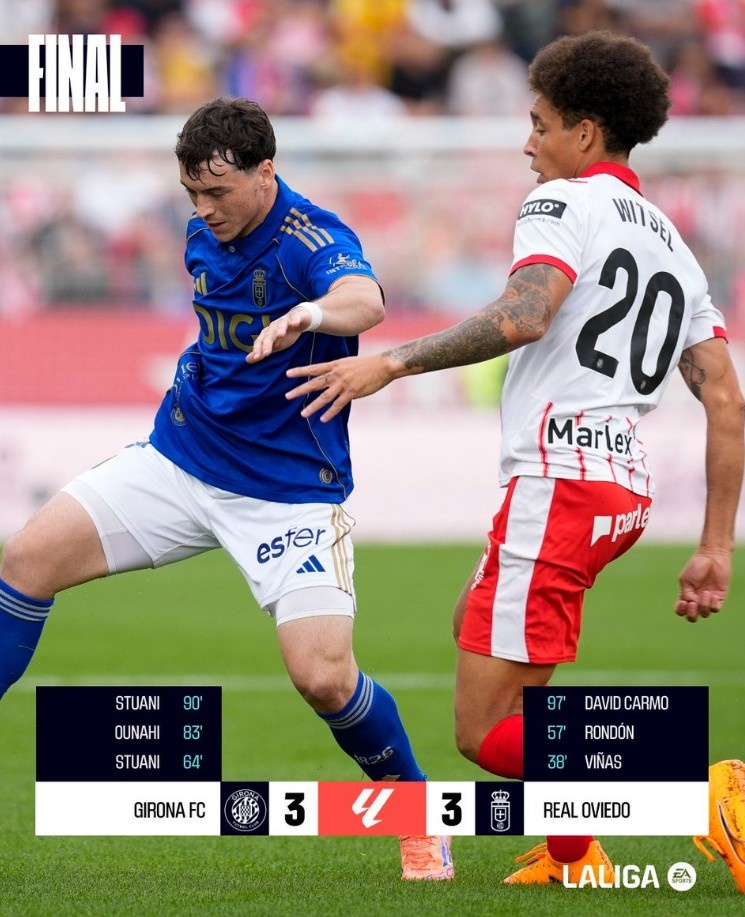 10月25日讯 在本轮西甲,赫罗纳3-3战平皇家奥维耶多。本场比赛可谓戏剧性十足,共出现3粒点球,并且有第97分钟绝平。