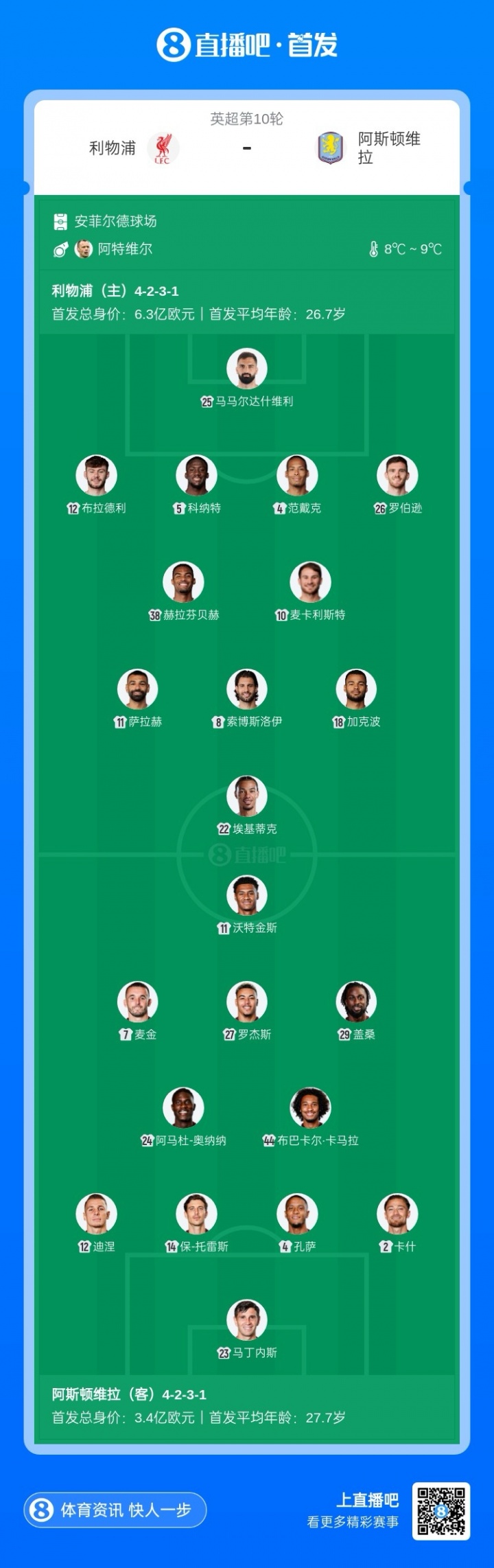 利物浦杆位:25-马马尔达什维利、4-范戴克、5-科纳特、12-布拉德利、26-罗伯逊、8-索博斯洛伊、10-麦卡利斯特、38-赫拉芬贝赫、11-萨拉赫、18-加克波、22-埃基蒂克