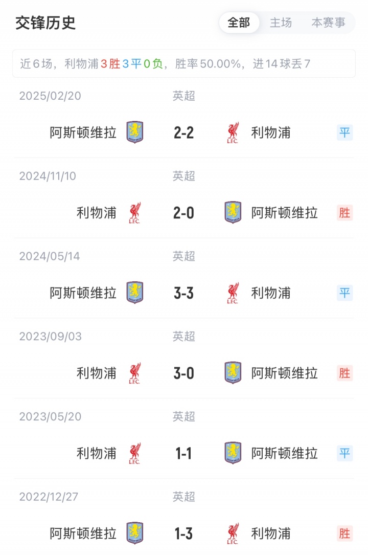 利物浦职业联赛 5胜4负积15分,近4轮遭遇4连败;维拉职业联赛 4胜3平2负积15分,目前职业联赛 4连胜。利物浦对阵维拉已连续10场不败(7胜3平)。