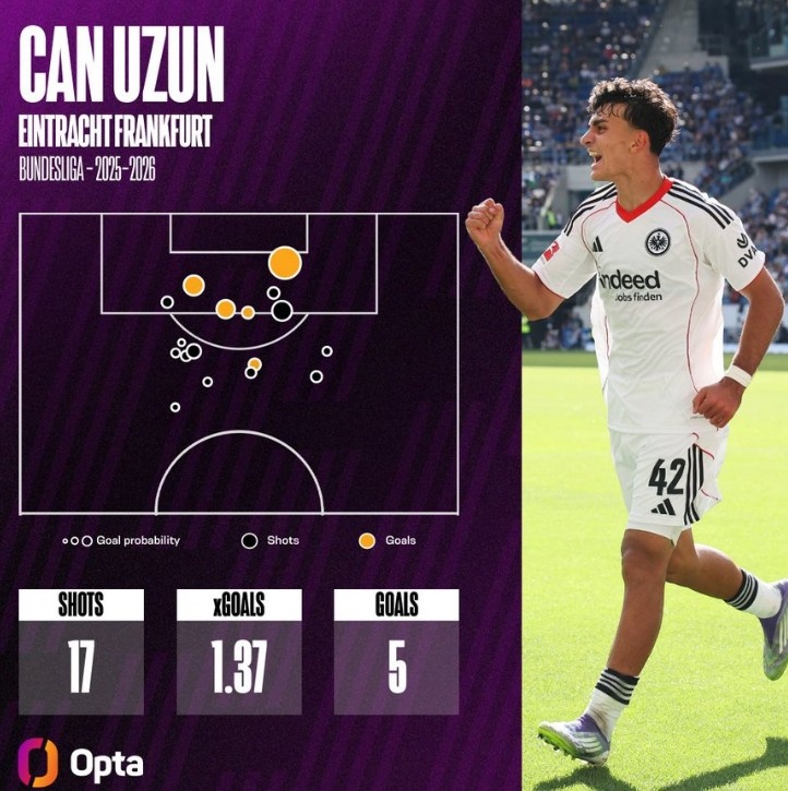 9月30日讯 本赛季法兰克福19岁小将乌尊状态出色,连续5场德甲破门,5场比赛5球3助攻。