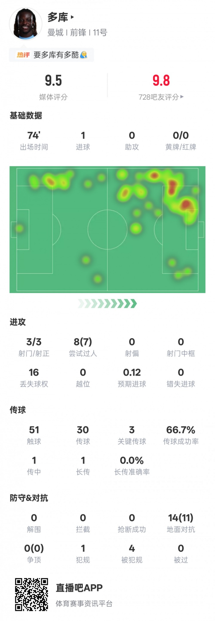 11月10日讯 英超第11轮焦点战,曼城主场迎战利物浦。多库首发登场,贡献1粒进球,英超直播_英超直播免费高清直播_英超直播在线高清(无插件)-24直播网8次过人7次成功,送出3次关键传球,评分9.5。
