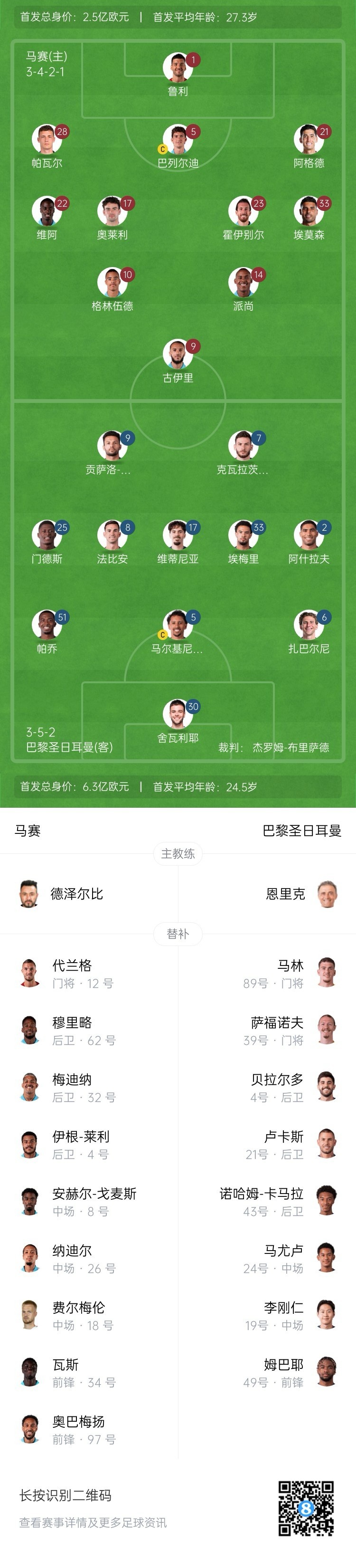巴黎杆位:30-舍瓦利耶、2-阿什拉夫、5-马尔基尼奥斯、6-扎巴尔尼、25-努诺-门德斯、51-威廉-帕乔、8-法比安-鲁伊斯、17-维蒂尼亚、33-扎伊尔-埃梅里、7-克瓦拉茨赫利亚、9-贡萨洛-拉莫斯