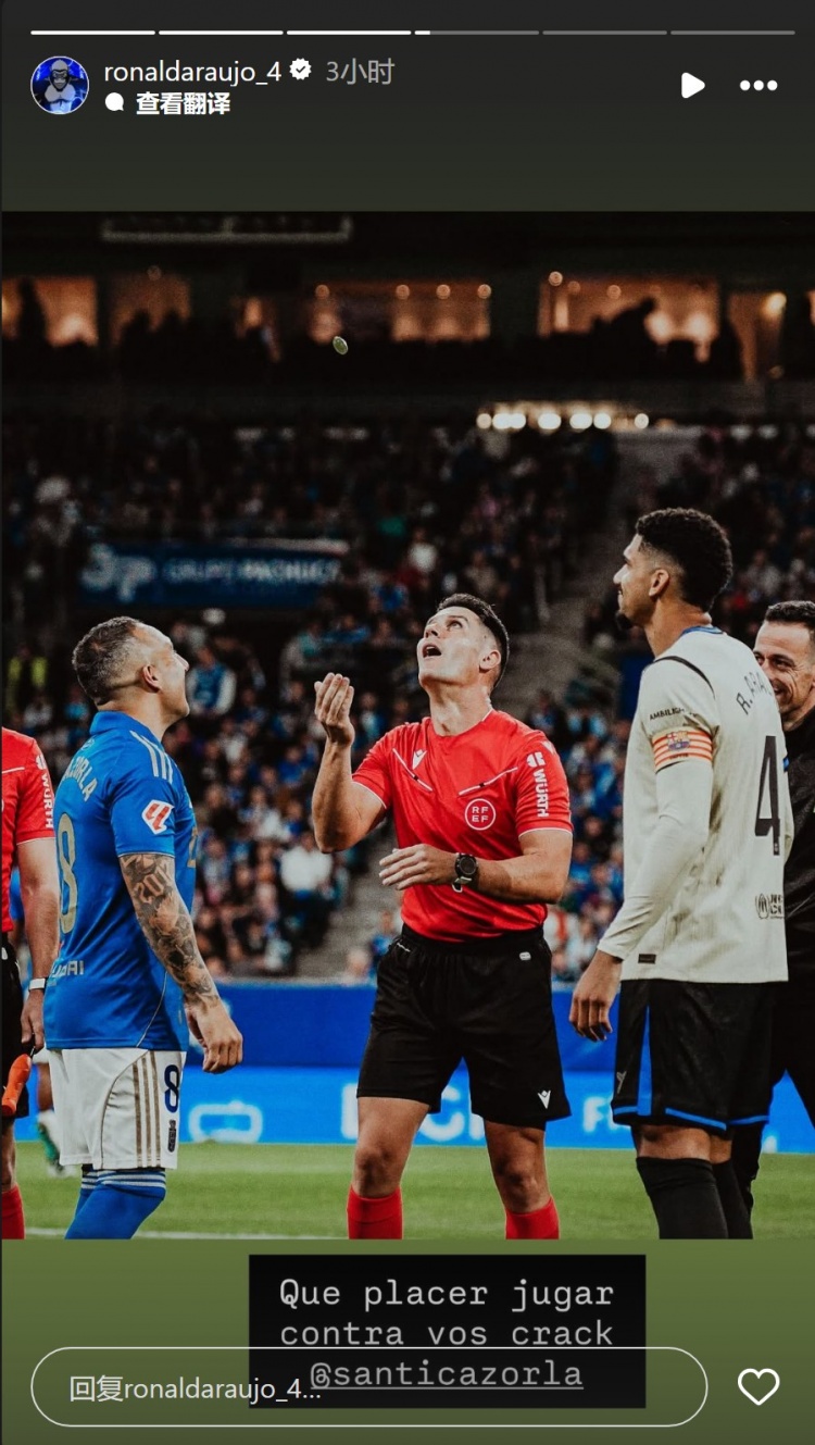 巴萨队长阿劳霍社媒晒出与卡索拉赛前选边的合照,英超直播_英超直播免费高清直播_英超直播在线高清(无插件)-24直播网配文:“很高兴与你同场竞技,大师。”