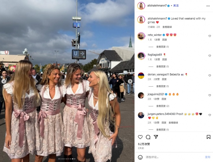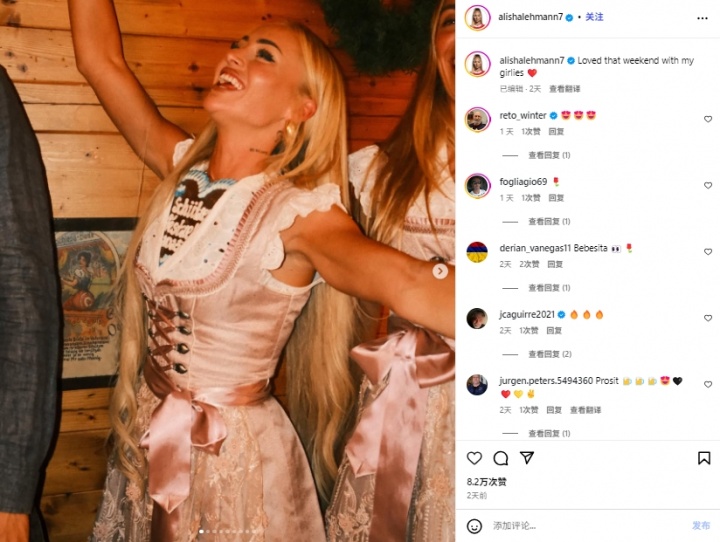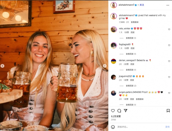 10月03日讯 据《太阳报》的报道,前维拉/尤文女古代足球 员,现效力于科莫女足的艾丽莎-莱曼在与队友一起参加慕尼黑啤酒节时,在社媒发布的照片中巧妙地暗示了自己的单身竞技状态 。
