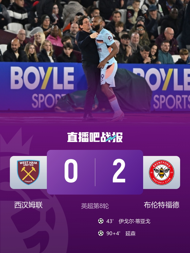 英超第8轮,西汉姆联0-2布伦特福德,遭遇主场作战 4连败。